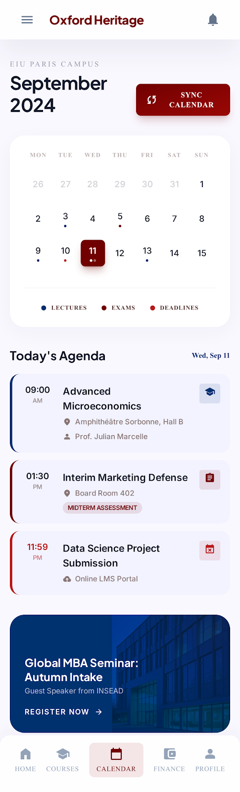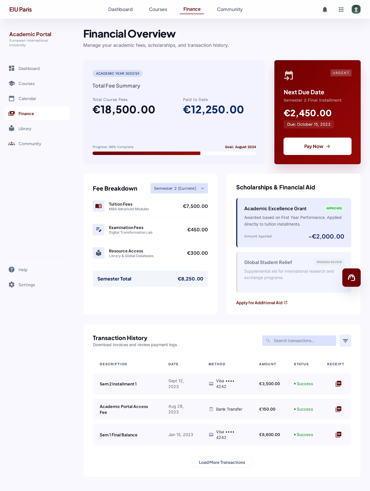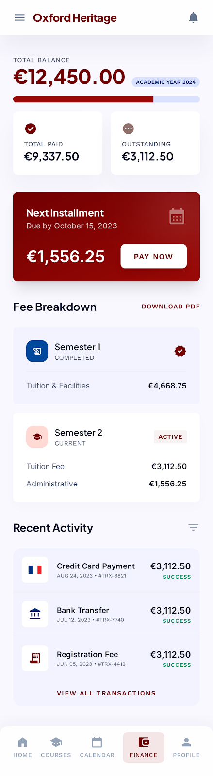 - Finance: View fee breakdown, pay fees, and track dues