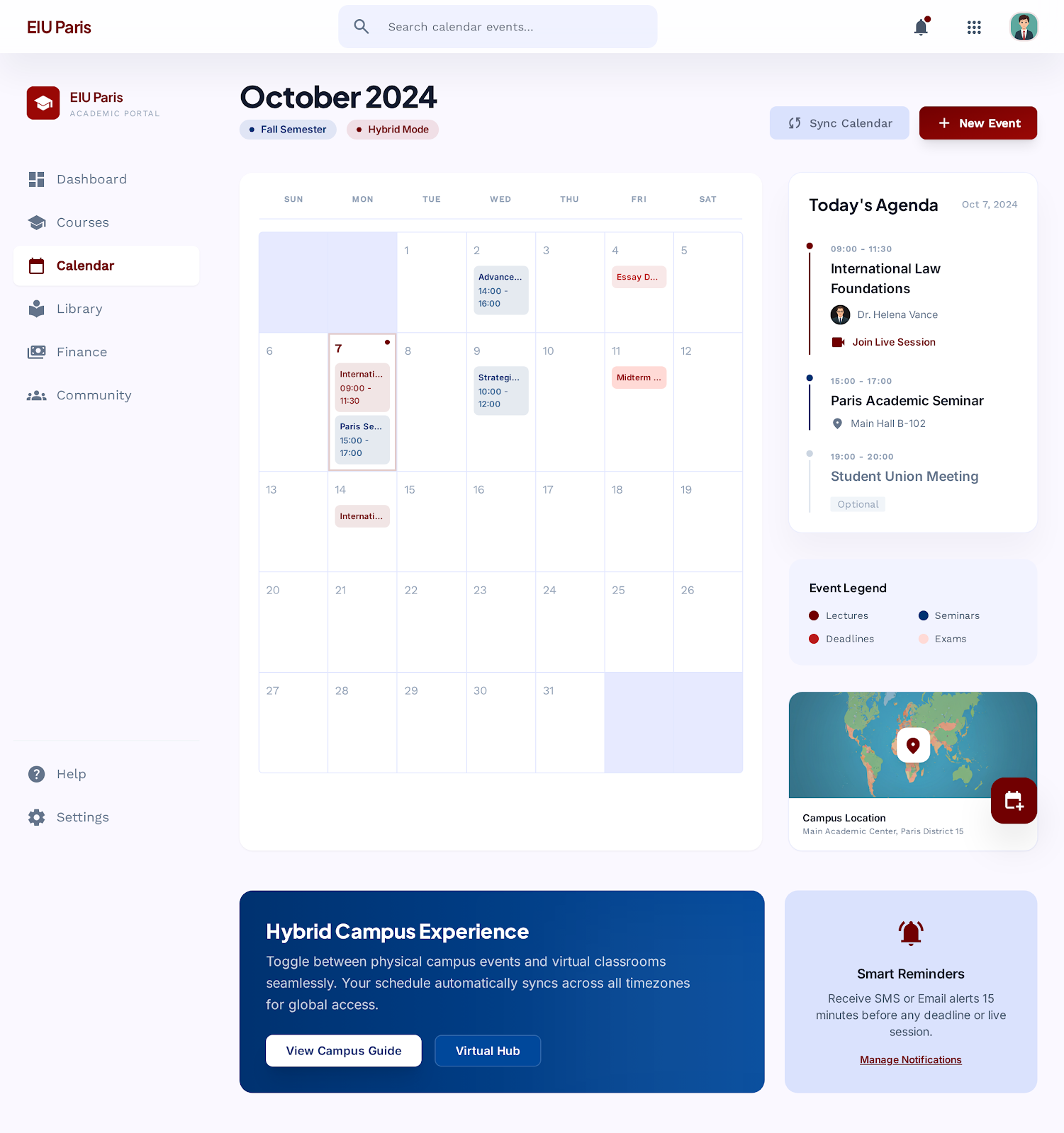Hybrid classes, lecture archives, structured modules, assessments, and attendance tracking.