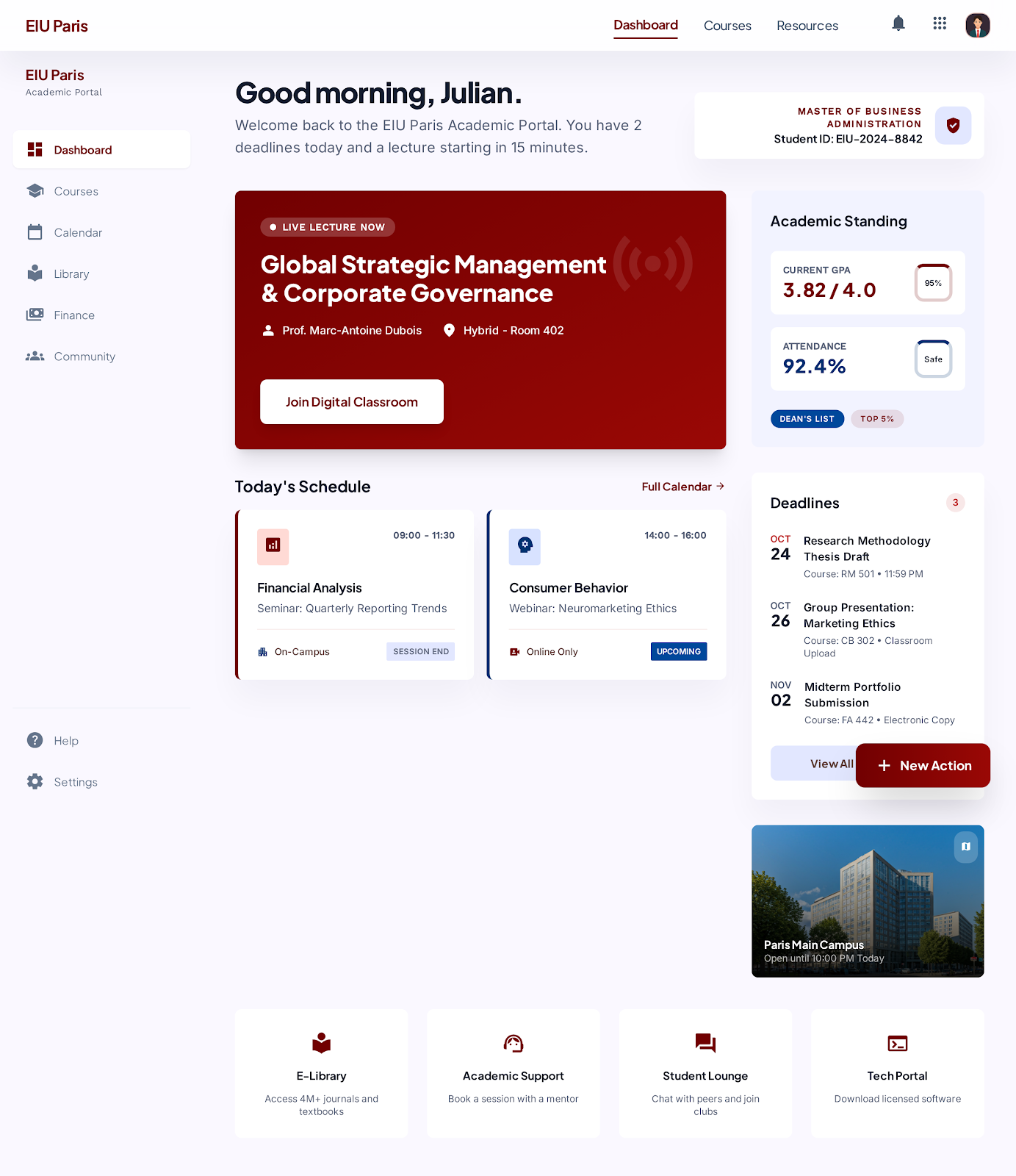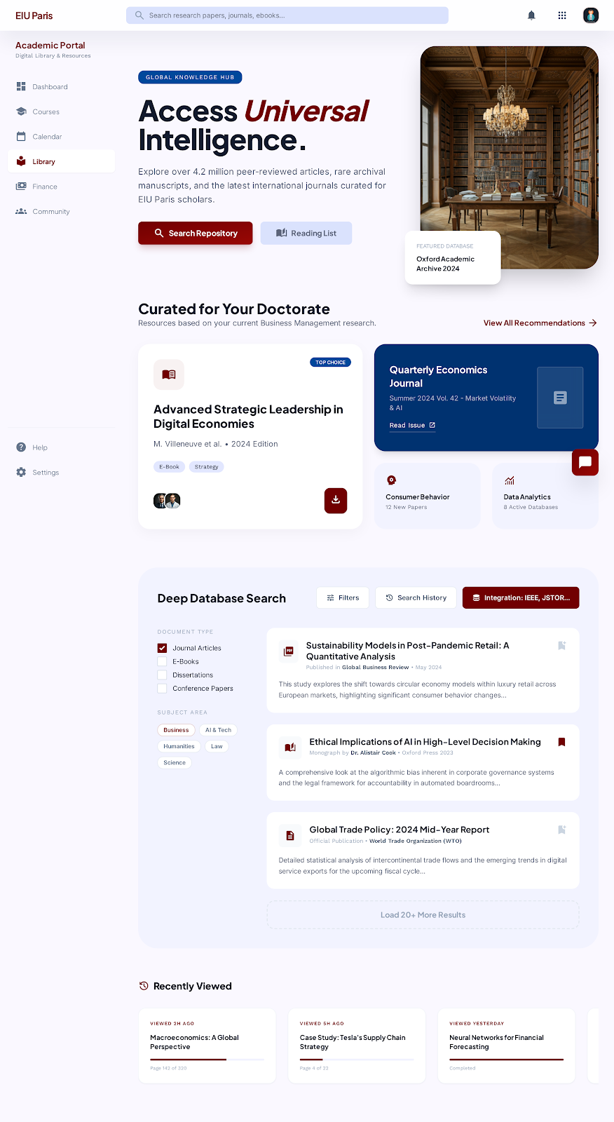 Digital library access, research assets, and curated academic resource journeys.