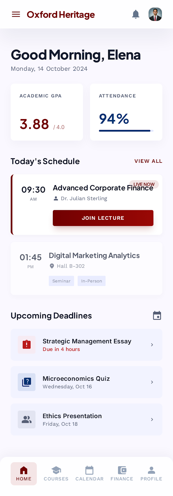 - Academic Tracking: View attendance, GPA/performance, and deadlines